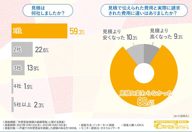 「見積もりは何社しましたか」と質問したところ、『1社(59.3%)』と回答した方が最も多く、次いで『2社(22.6%)』『3社(13.9%)』『4社(1.9%)』『5社以上(2.3%)』と続きました。