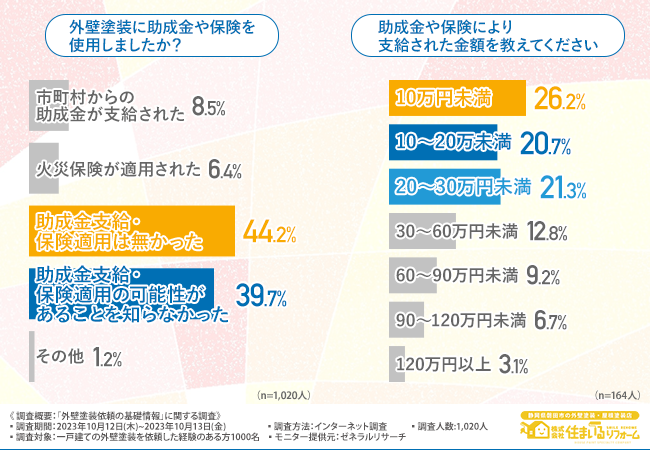 「外壁塗装に助成金や保険を使用しましたか」と質問したところ、『助成金支給・保険適用は無かった(44.2%)』と回答した方が最も多く、次いで『助成金支給・保険適用の可能性があることを知らなかった(39.7%)』『市町村からの助成金が支給された(8.5%)』『火災保険が適用された(6.4%)』と続きました。