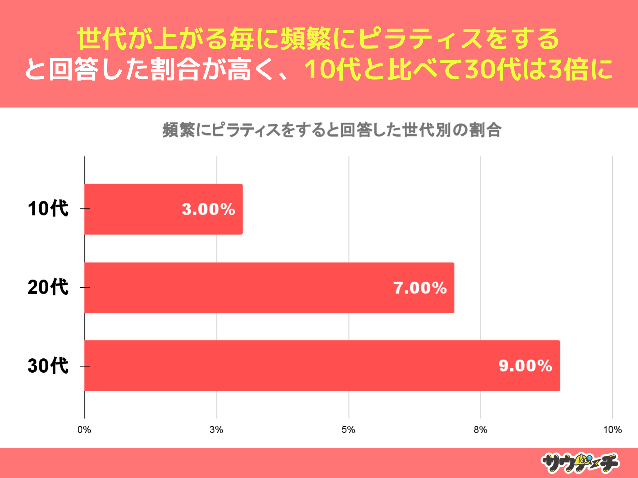 頻繁にピラティスをすると回答した割合を世代別でみてみますと、30代の9%が最も高く、次いで20代の7%、10代が3%で、10代と比べて30代は3倍高いことがわかりました。