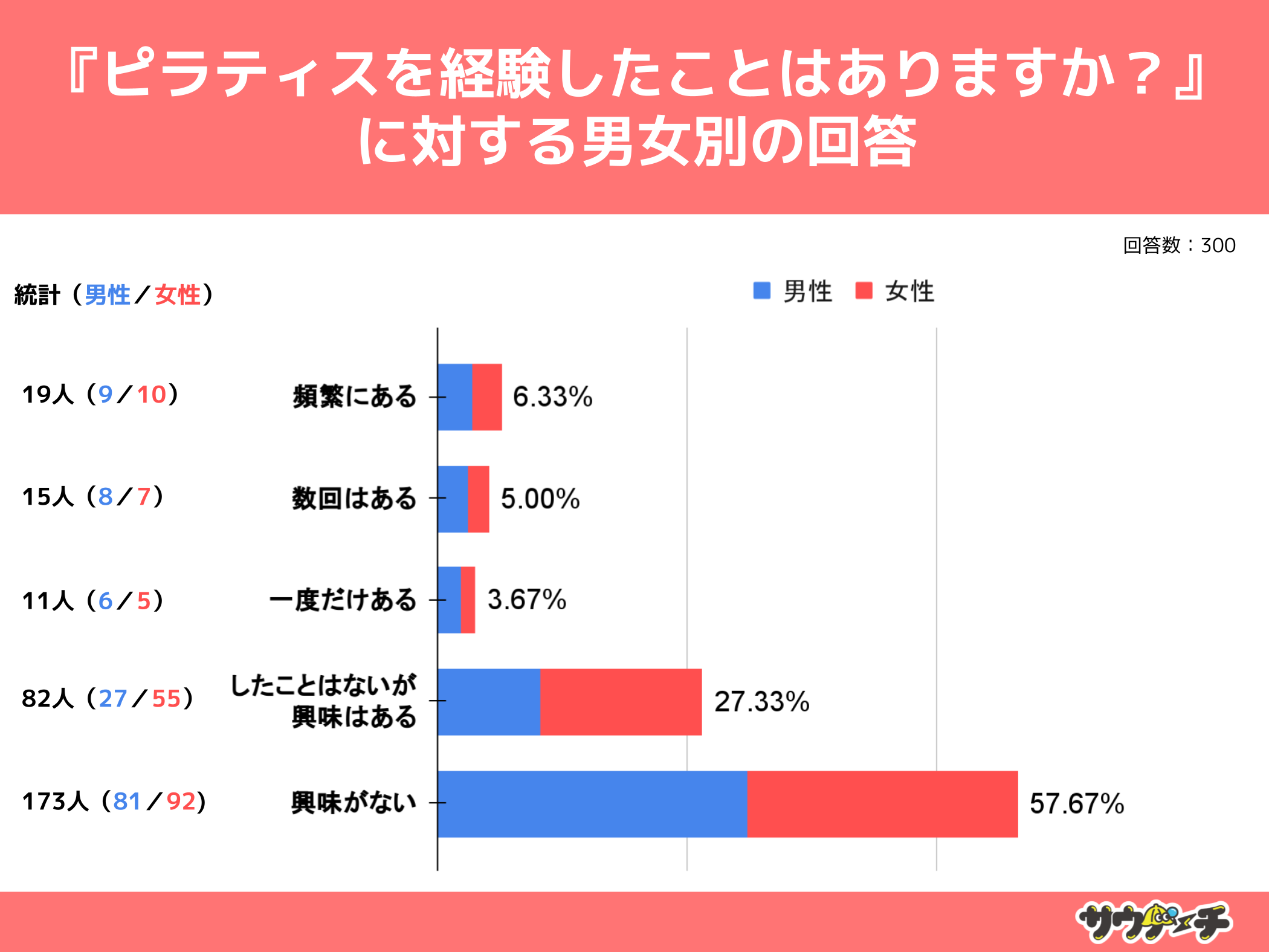 10代〜30代男女を対象とした『ピラティスを経験したことはありますか?』というアンケートで、最も多かった回答は「興味がない」で57.67%でした。