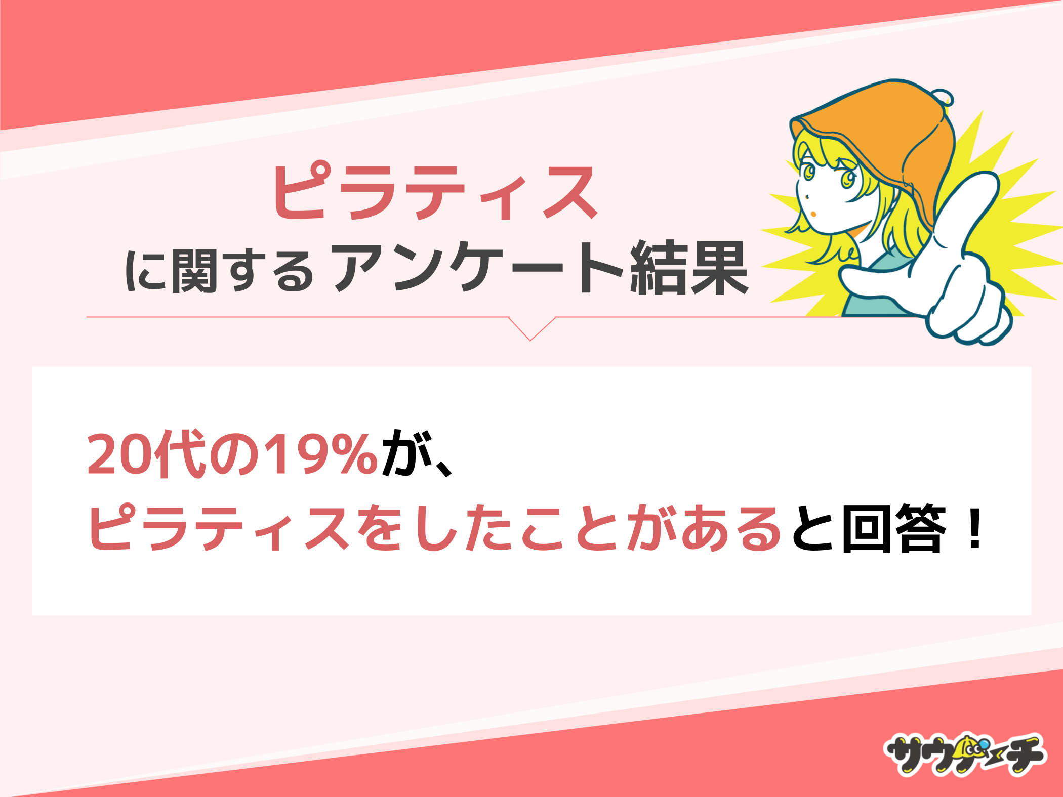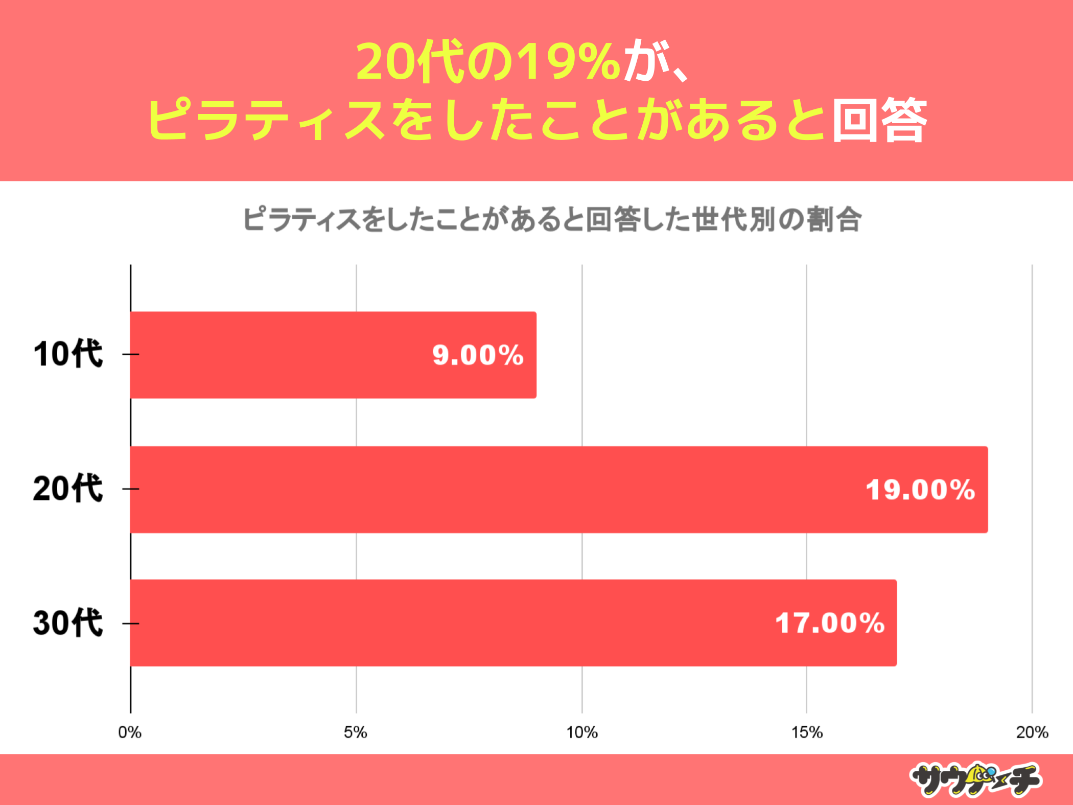 また、ピラティスをしたことがあると回答した割合を世代別でみてみますと、20代の19%が最も高く、次いで30代の17%、10代が9%で、20代の約20%がピラティスの経験があることがわかりました。