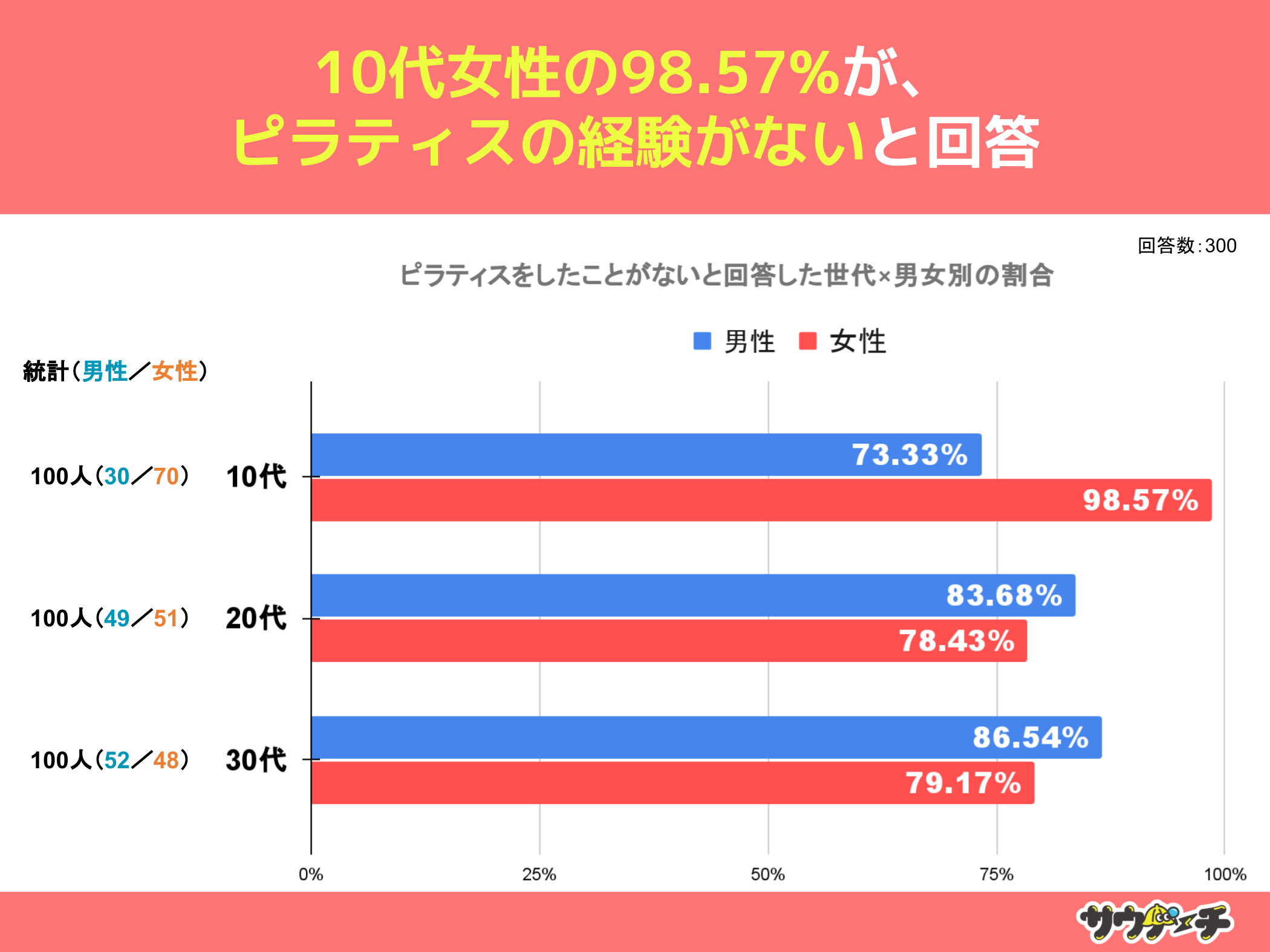 ピラティスをしたことがないと回答した割合を世代×男女別でみてみますと、10代女性の98.57%が最も高く、次いで30代男性の86.54%、20代男性が83.68%で、10代女性のほぼ全員がピラティスの経験がないという結果になりました。