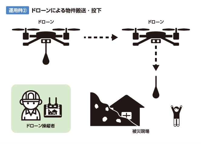 また「物件搬送・投下装置」は、土砂災害により車両が近づけない場所にいる要救助者へ、救助資機材、飲食物の運搬することを可能とします。(図 運用例②参照)
