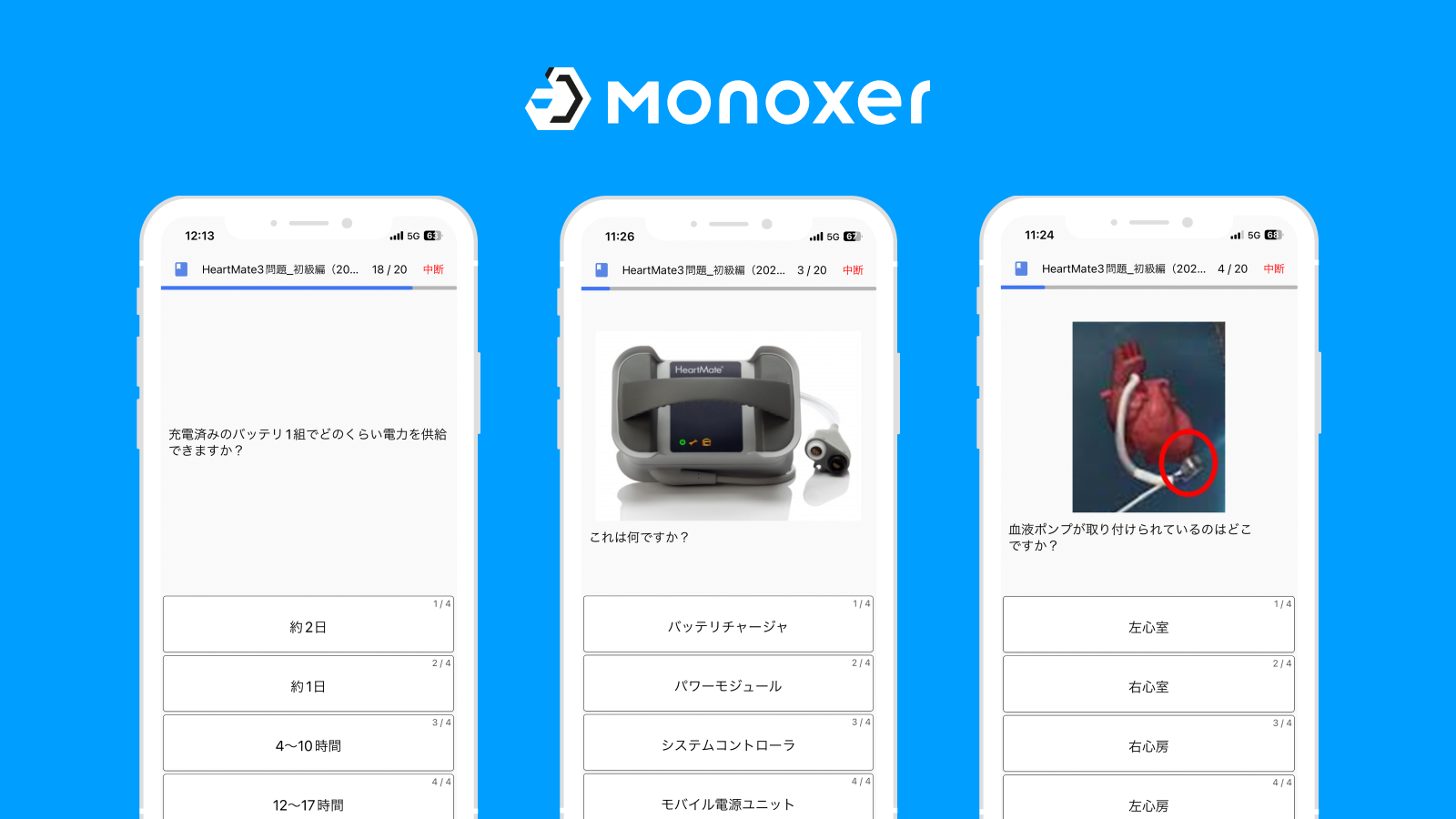 Monoxer はAI機能を有するスマートフォン学習アプリです。学習者がアプリを使い学習する中で、AI機能により習熟度・忘却度に応じて問題の出題頻度・難易度を調整します。オリジナル教材を、Monoxerを通じて学習者に配信することも可能です。本研究では東京医科歯科大学病院のMEセンターで作成したオリジナル教材を用いました。病院独自のコンテンツを作成し学習に用いることで、補助人工心臓の正しい使い方が理解できるようになっています。