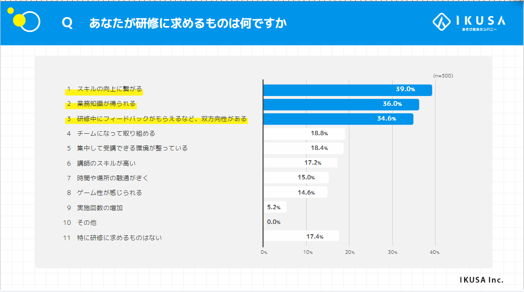 研修に求めるものは「スキルの向上に繋がる(39.0%)」「業務知識に繋がる(36.0%)」「研修中に双方向性がある(34.6%)」の3つが特に高い回答となりました。
