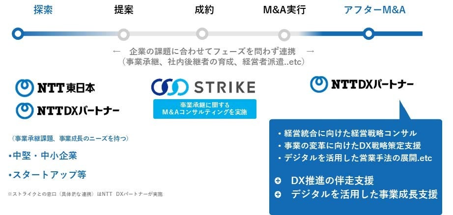 NTT DXパートナー、NTT東日本にて地域企業の事業承継課題を引き出し、ストライクと共同で解決を図ります。加えて、事業承継課題解決後は、経営戦略の相談相手としてNTT DXパートナーがお客さまと伴走を続け、企業変革のサポートを実現します。