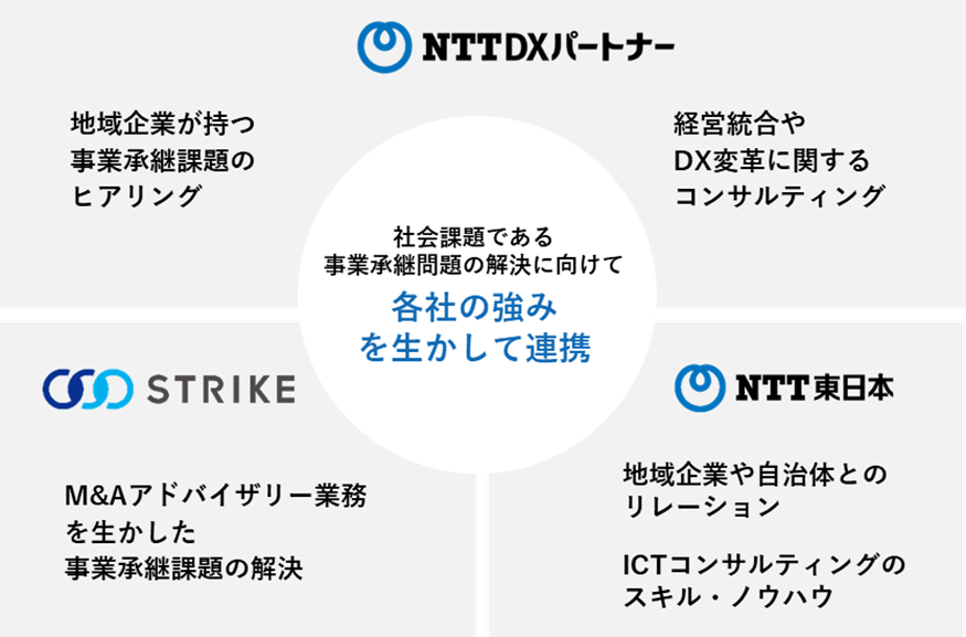 これらの課題に対してスピーディーかつ正確に解決へ導くために、事業承継コンサルの第一人者であるストライクと、地域企業のDXを用いた課題解決の経験・知見を持つNTT DXパートナーが連携し、地域社会の課題解決へのさらなる貢献を目指します。