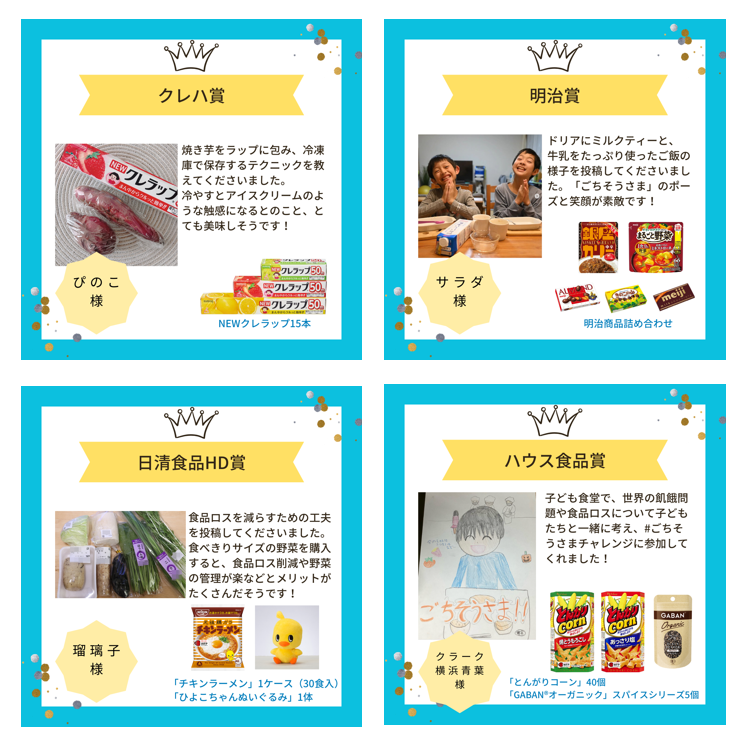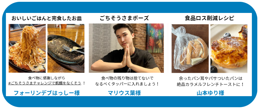 前身の「ゼロハンガーチャレンジ~食品ロス×飢餓ゼロ~」から6年目(#ごちそうさまチャレンジは昨年に引き続き2年目)を迎える本年は過去最高の211,394件の寄付対象アクションが集まり、50万人分の学校給食支援数となりました。投稿には、食事を完食し「ごちそうさま」をしたことを示す、食べる前と食べ終わった後のお皿の比較写真や、食品ロス削減レシピ、見切り品の購入など、様々な取り組みが寄せられました。また、普段の何気ない食事やカフェでの食事など、キャンペーン用の特別な投稿ではなく、気軽に身近にできることを再認識した投稿も多く寄せられました。その他、キャンペーンアンバサダーの投稿に感化された参加者も多くいました。