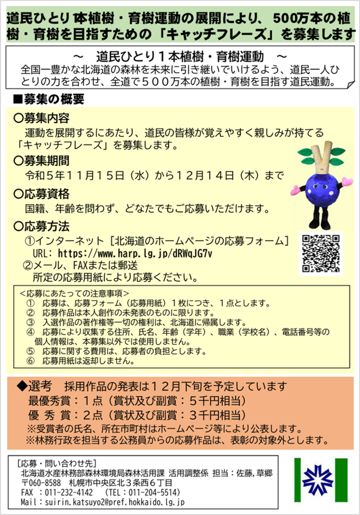 本運動を展開するにあたり、道民の皆様が覚えやすく親しみが持てる「キャッチフレーズ」を募集しています。国籍、年齢を問わず、どなたでもご応募いただけます。募集に関する詳細は、「チラシ」「応募要領及び応募用紙」をご覧ください。