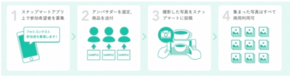 企業が、Snapmartに写真を投稿・販売するクリエイターから写真を募り、参加者(アンバサダー)を選定の上、「⾃社商品のサンプリング」及び、「SNSプロモーションにおける効果的なクオリティの⾼いユーザー撮影による写真・動画 の⼤量収集」と「ユーザー体験(⼝コミ)の拡散」を依頼することができるサービスです。