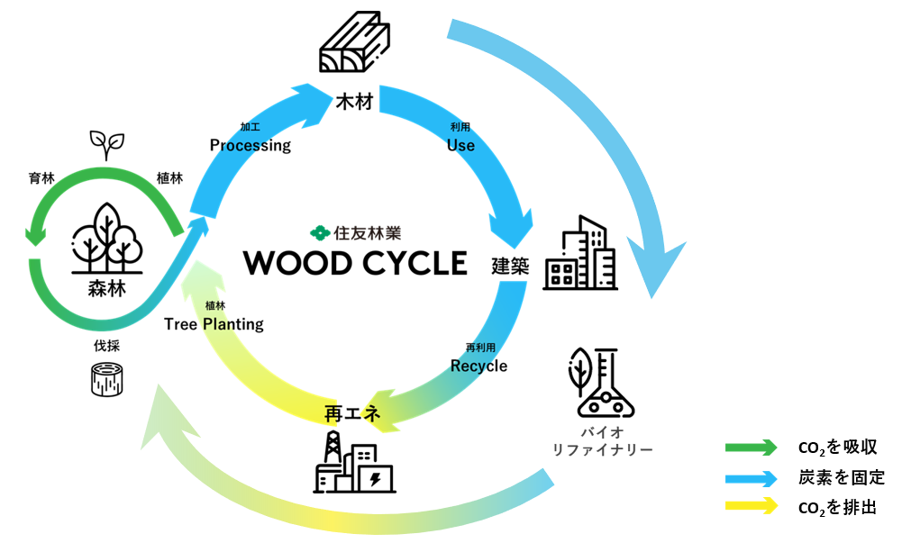 住友林業グループは森林経営から木材建材の製造・流通、戸建住宅・中大規模木造建築の請負や不動産開発、木質バイオマス発電まで「木」を軸とした事業をグローバルに展開しています。2030年までの長期ビジョン「Mission TREEING 2030」では住友林業のバリューチェーン「ウッドサイクル」を回すことで、森林のCO2吸収量を増やし、木造建築の普及で炭素を長期にわたり固定し、自社のみならず社会全体の脱炭素に貢献することを目指しています。