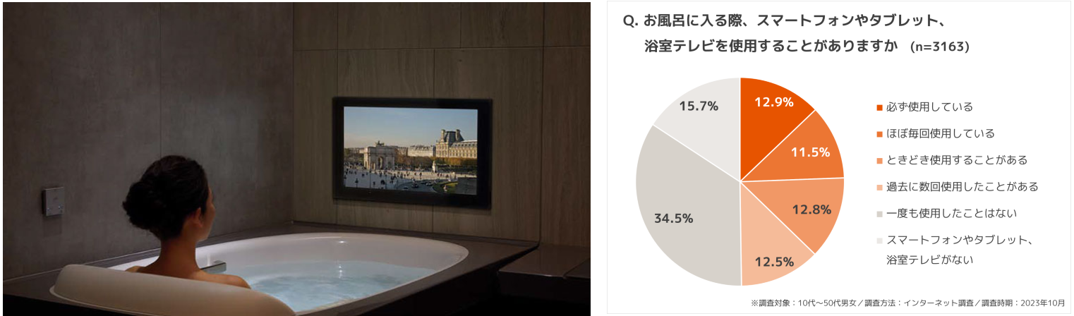 近年、1日当たりの休養・くつろぎの時間は増加傾向にあり、その代表とも言える入浴に関しては、スタイルの多様化が見受けられ、入浴時にテレビを視聴する人のほか、スマートフォンなどのデバイスを使う人が増加しています(※1)。