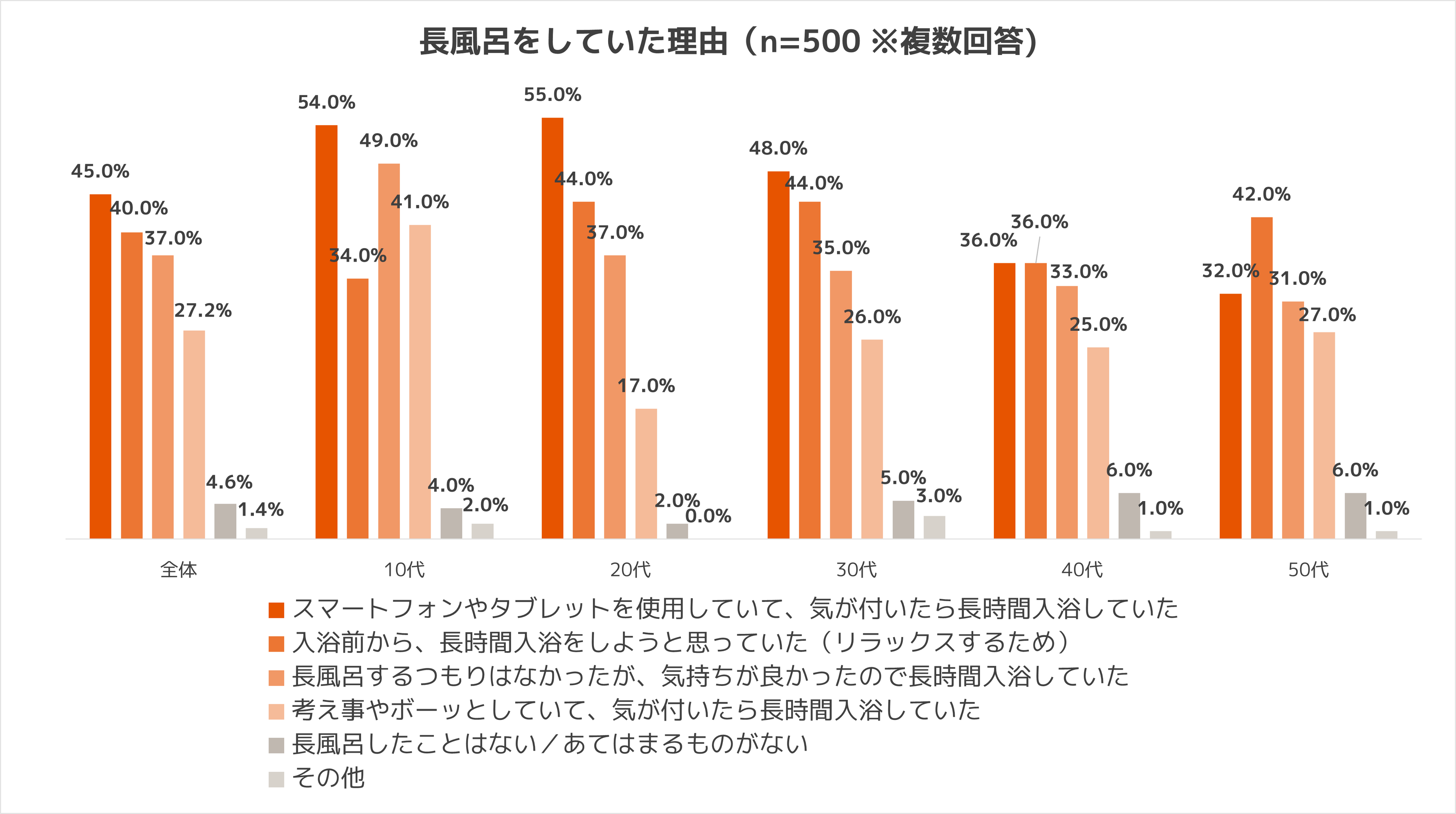 長風呂をしていた理由として、「スマートフォンやタブレットを使用していて、気が付いたら長時間入浴していた」という人が45.0%と最も多い結果に。特に10代~20代は、5割以上が長風呂の理由にスマホ利用を挙げていました。一方、30代や50代では入浴前からリラックスを目的に長風呂を楽しもうとする人も多いことがわかりました。