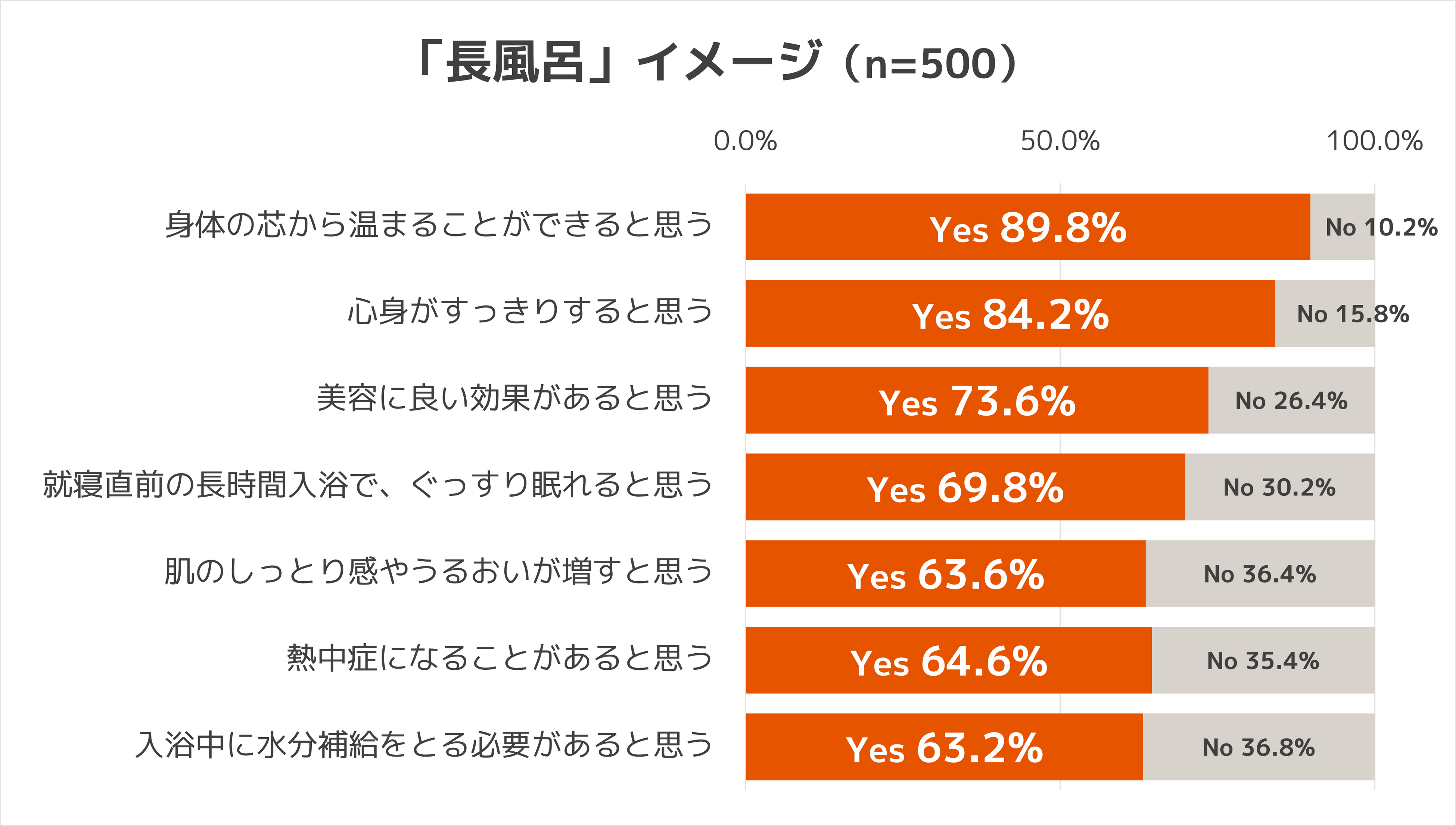 ・長風呂で「身体の芯から温まると思う」が9割、「美容に効果があると思う」は7割以上に