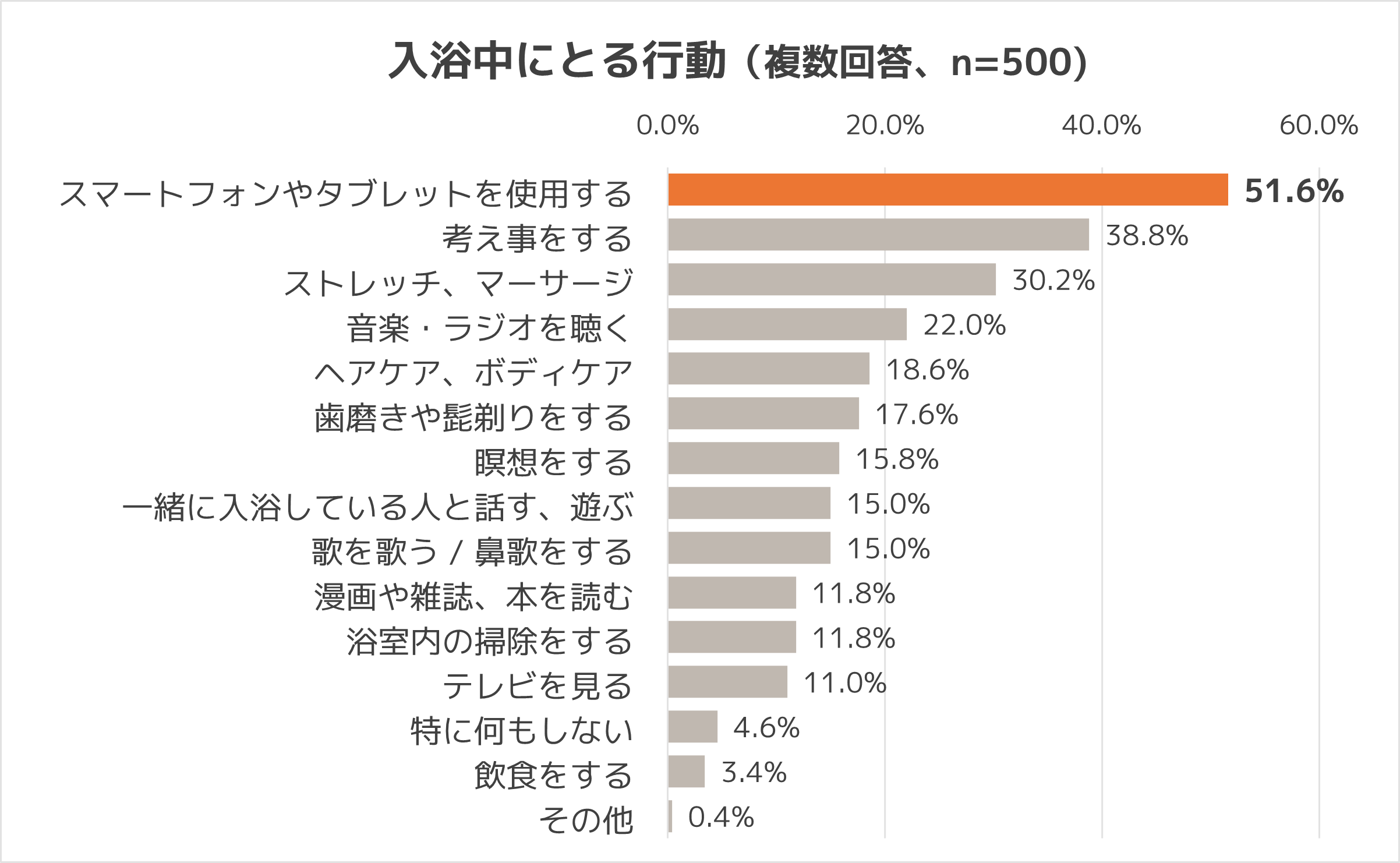 <本調査>入浴時にスマートフォンなどの使用経験が過去1回以上ある10代~50代男女、500人