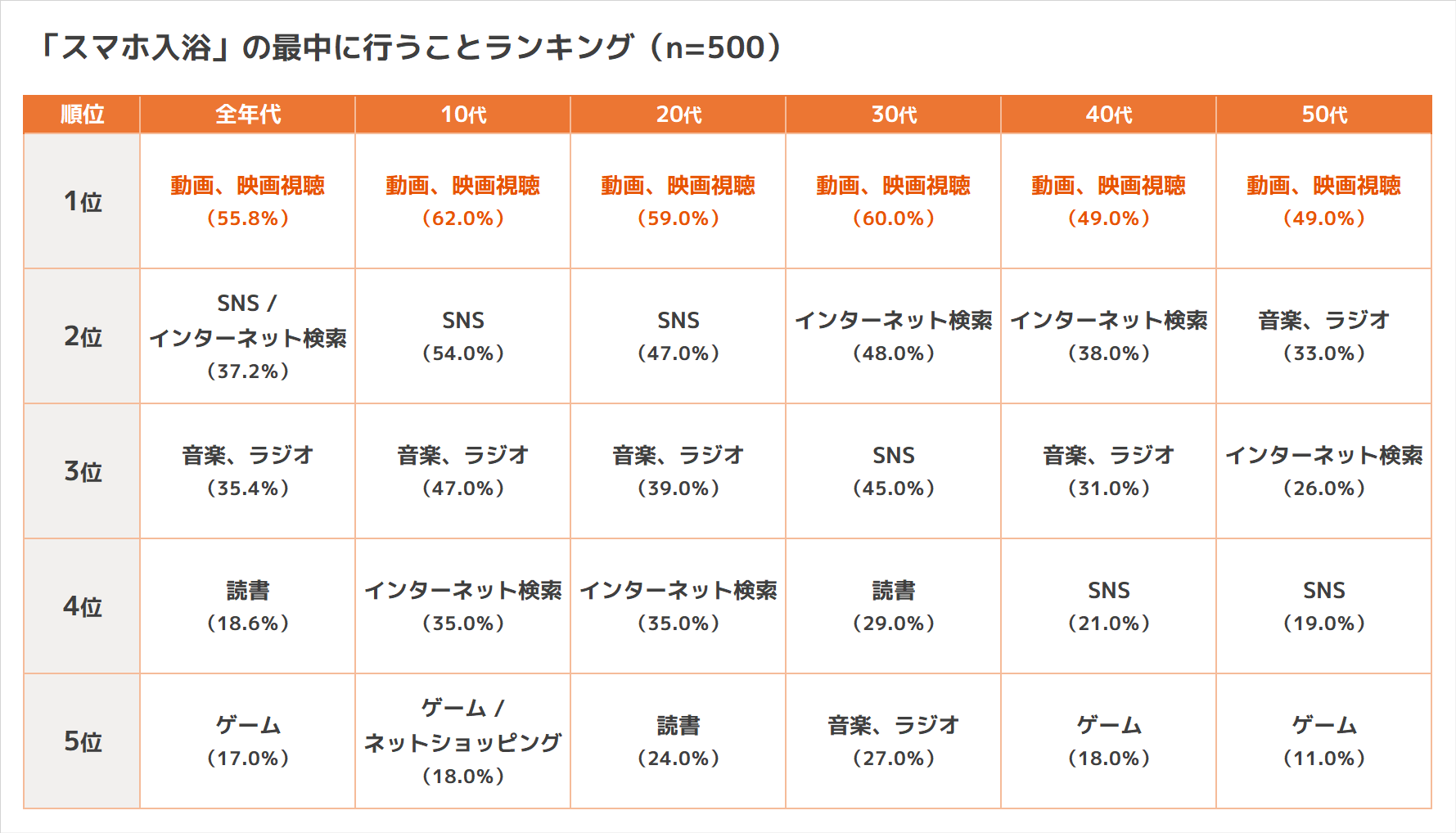 入浴中のスマホで「動画、映画視聴」は10代〜50代で1位に