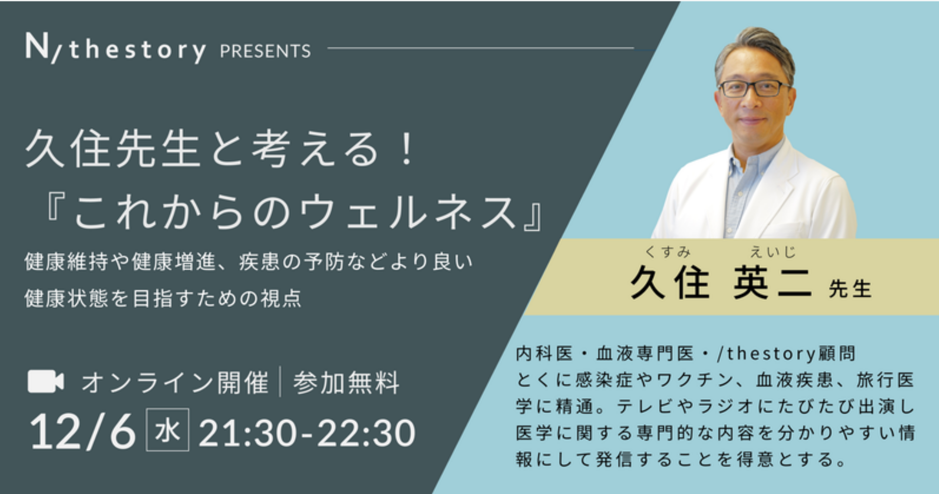 内科医・血液専門医としてさまざまなメディアで専門的な内容をわかりやすく発信する久住氏が、thestoryの顧問として”これからのウェルネス”を考えるオンラインイベントに登壇します。無料、事前登録制で、アーカイブ配信は無しの貴重なライブイベントです。