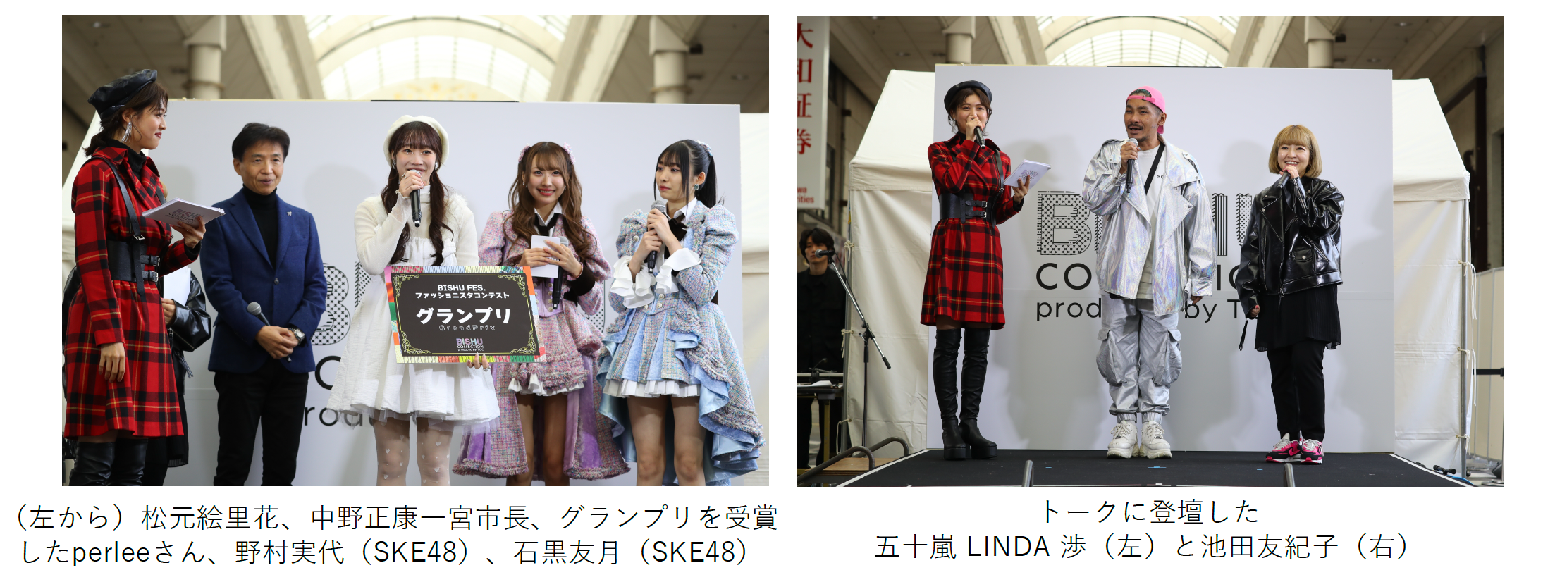 BISHU FES.ファッショニスタコンテストでは、個性あふれる18組の参加者が自慢のファッションで出場!グランプリは、名前の由来でもある真珠のように淡く純白な衣装を纏ったperlee(ペルレ)さんが受賞!審査員を務めた野村は「まるでアイドル。私が着たいくらいです!これからも可愛いを貫いてほしい。」と、同じく審査員を務めた石黒は「服ももちろんですが、アクセもネイルも全て、可愛いが詰まってる!」と大絶賛!東京ガールズコレクション実行委員会チーフプロデューサーの池田友紀子は「頭の先からつま先までバッチリ。トータルでファッションを楽しむって最高だなと。まさに一宮のファッショニスタです。」とコメントし、中野市長は「私は市長の特権で舞台に上がっていますが、この舞台に立つのは大変。今回100組近い応募があり、その中からの選りすぐりでグランプリを獲得された。一宮のファッションのレベルの高さを証明してくれました。これからも頑張ってください!」とエールを送りました。そのほか、一宮コスプレランウェイステージが行われ、会場は大いに盛り上がりました。