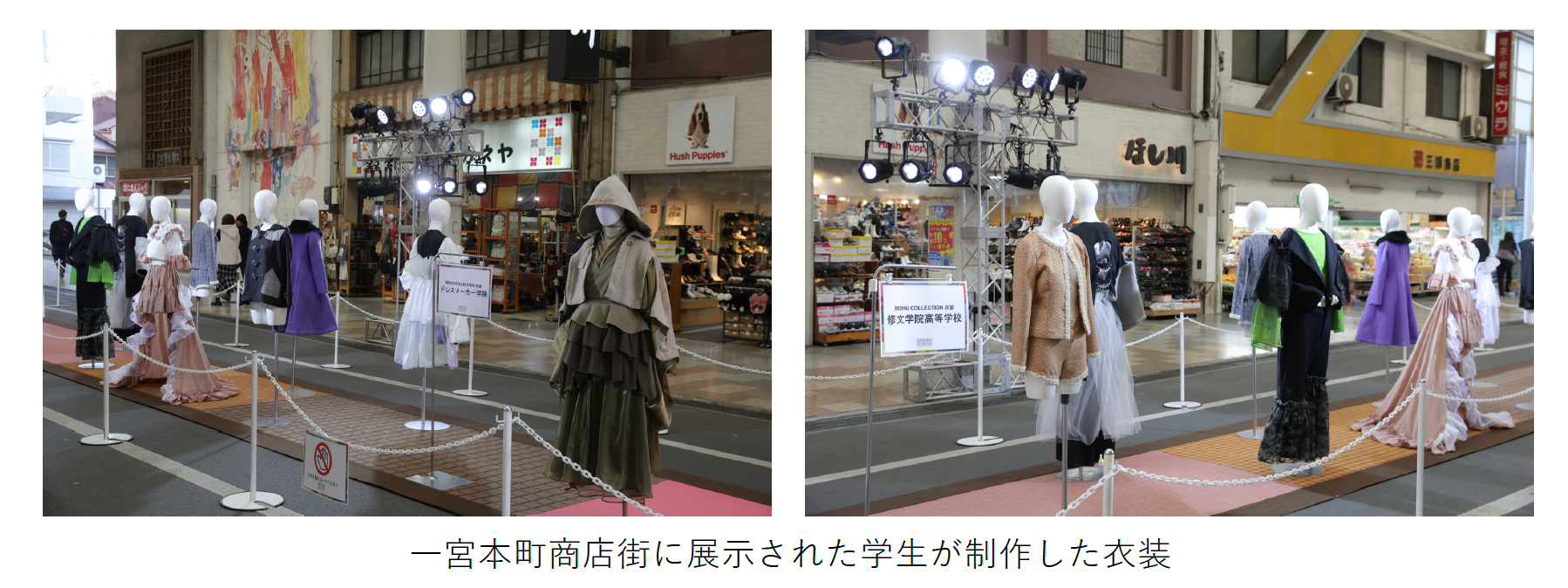ファッションショーを終えた高校生は「緊張しましたが、貴重な経験をすることができて嬉しく思います。」とコメント。イベント後には、実際に製作した衣装の展示が行われ、通りかかった多くの方々がその様子を写真に収めていました。