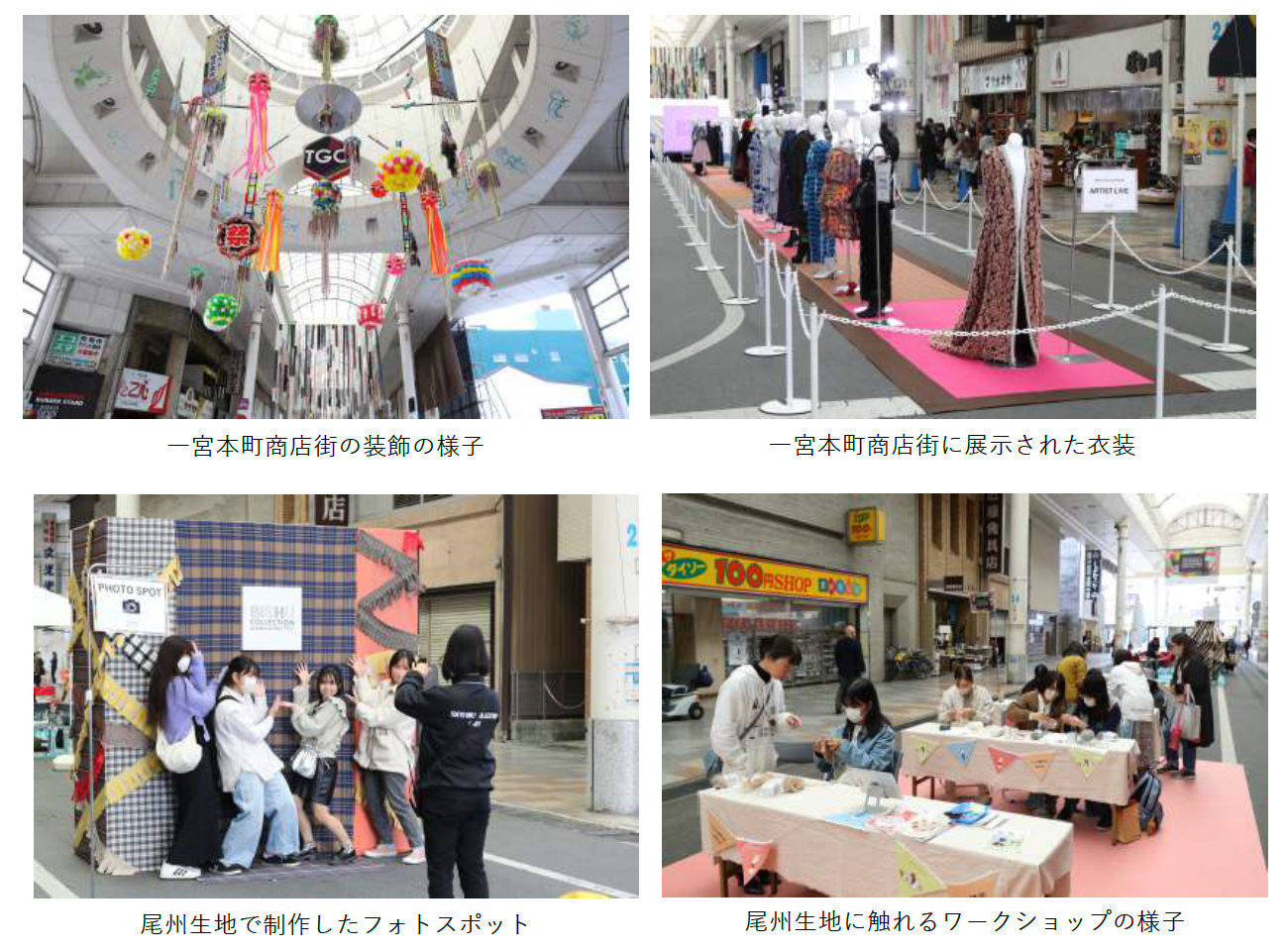 今回、同商店街に「Street Runway」「Installation Area」「Booth Area」の3つのエリアが登場。Street Runwayは、一宮市本町商店街に突如現れた長さ約40mの特設ランウェイで、修文学院高等学校の学生が尾州を使用して制作に携わりました。