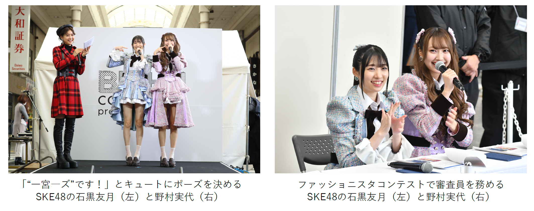 12日(日)には、尾州ツイードで作られた衣装を着用した野村実代(SKE48)と石黒友月(SKE48)が登場。開催地である一宮出身の2人は、ステージに上がると「私たち2人合わせて、“一宮―ズ”です!」とキュートにポーズを決めると、駆けつけたファンからは拍手が!地元のイベントへの出演に野村は「寒い中ありがとうございます。地元でイベントに出演できて大変光栄です。」と喜びを伝えると、石黒は「地元でこうしてお仕事ができて、ファンのみさなんが地元まで駆けつけてくれて、見守ってもらえて嬉しい。」とコメントしました。また、中野正康一宮市長も駆けつけ「(このイベントを作り上げるのに)たくさんの方にお世話になったが、一番感謝を申し上げたいのは、わざわざ商店街に集まってくれてお祭りを盛り上げてくれた観衆のみなさんです。これからも一宮を盛り上げてほしい。」と来場者へ感謝を述べました。