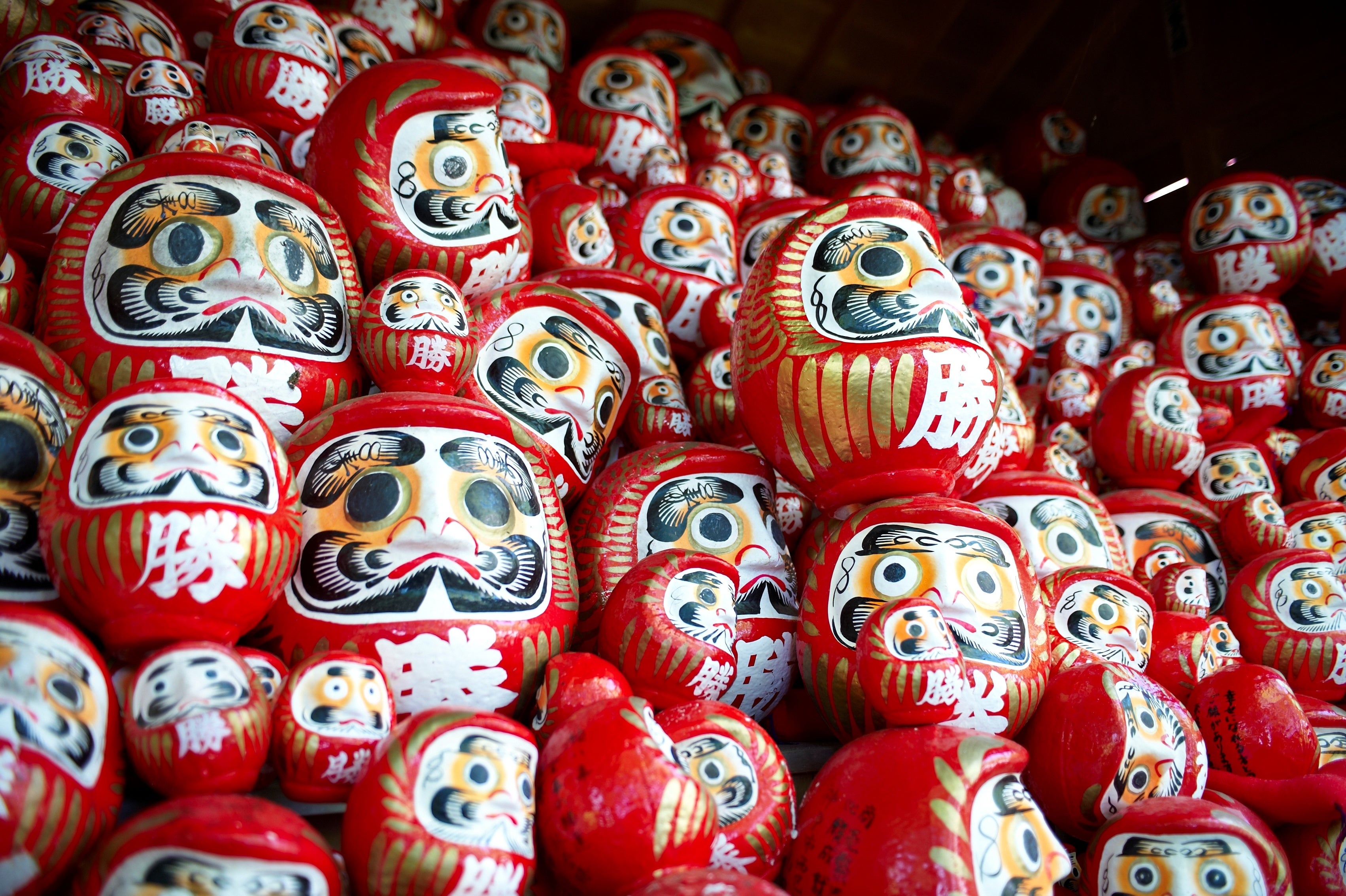 勝尾寺の「勝ちダルマ」は世界でも知られ始めており、腹の部分に大きく「勝」と書かれたその意匠が特徴的で、勝尾寺でしか授かることが出来ず、願いを込める時に片目を入れ、願意が成就した暁には、もう片方の目を入れて寺に報告奉納(報納)参拝することが勝尾寺の慣わしとなっています。境内にある「勝ちダルマ奉納棚」には数えきれないほどの勝ちダルマが奉納されており、この寺の願意成就力の凄まじさを実感する名所にもなっています。