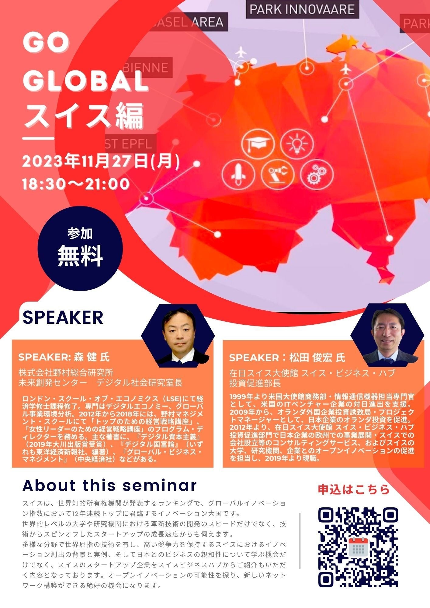 スイスは、世界知的所有権機関が発表するランキングで、グローバルイノベーション指数において12年連続トップに君臨するイノベーション大国です。 世界的レベルの大学や研究機関における革新技術の開発のスピードだけでなく、技術からスピンオフしたスタートアップの成長速度からも伺えます。 多様な分野で世界屈指の技術を有し、高い競争力を保持するスイスにおけるイノベーション創出の背景と実例、そして日本とのビジネスの親和性について学ぶ機会だけでなく、スイスのスタートアップ企業をスイス・ビジネス・ハブからご紹介もいただく内容となっております。オープンイノベーションの可能性を探り、新しいネットワーク構築ができる絶好の機会になります。