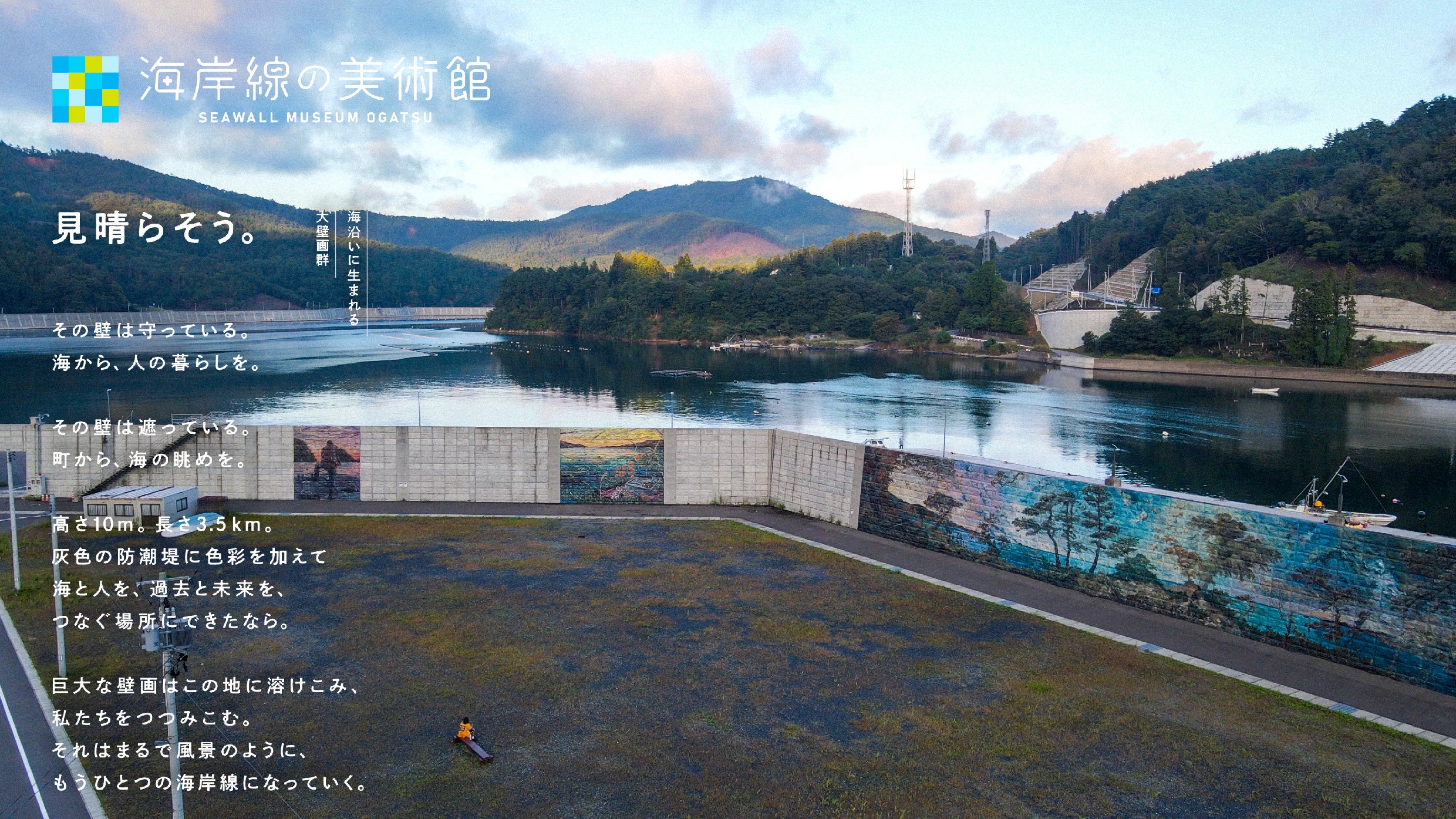 2022年11月に宮城県石巻市雄勝町に誕生した野外美術館です。2011年に発生した東日本大震災後に海岸線を囲うように建設された、高さ最大10m、全長約3.5kmの巨大な灰色の防潮堤の壁面に壁画を描き、壁によって海の風景を見ることができなくなった海岸線に新しい風景を生み出すことで、人と防潮堤の新たな関係性を築くことを目指しています。毎年、地域住民や全国の支援者を巻き込みながら徐々に壁画の数や範囲を増やしていき、町全体を美術館にしていく計画です。壁画から壁画まで海岸線沿いを巡って鑑賞することで、雄勝の魅力を隅々まで味わえる設計になっています。
