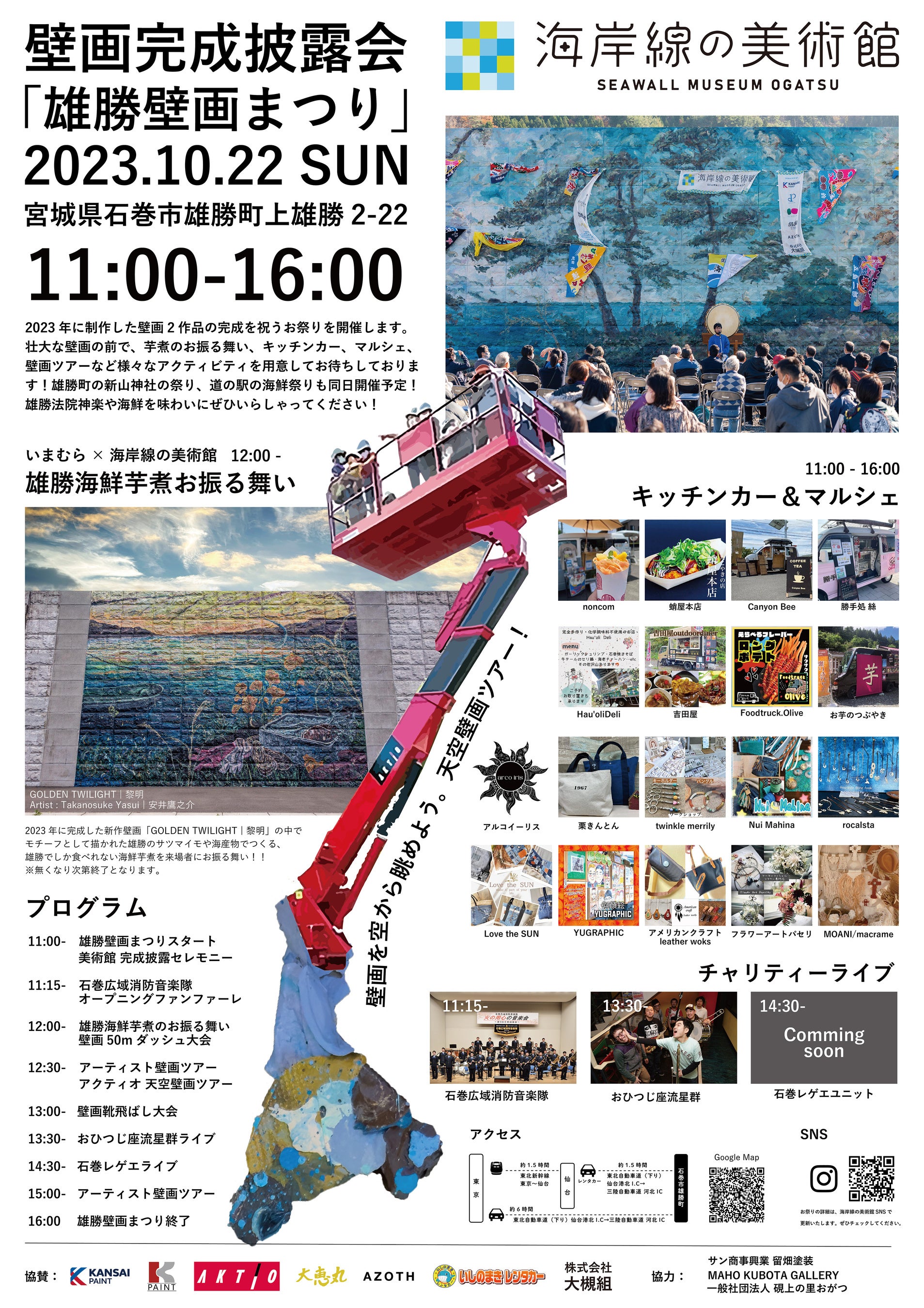 この度2023年に制作した壁画2作品の完成を祝うお祭り「雄勝壁画まつり」が10月22日(日)に宮城県石巻市雄勝町で開催されました。