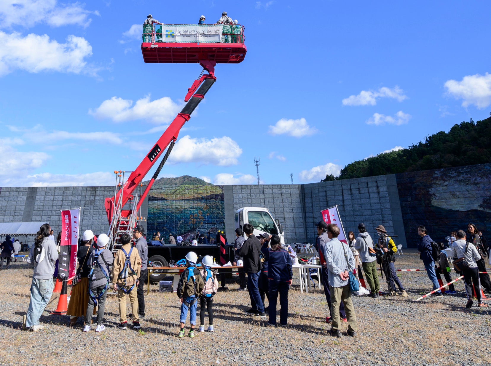 当日は、完成した壮大な壁画の前でアクティオの高所作業車を使い壁画を空から眺めることができる「アクティオ天空壁画ツアー」が開催され大いに盛り上がりました。