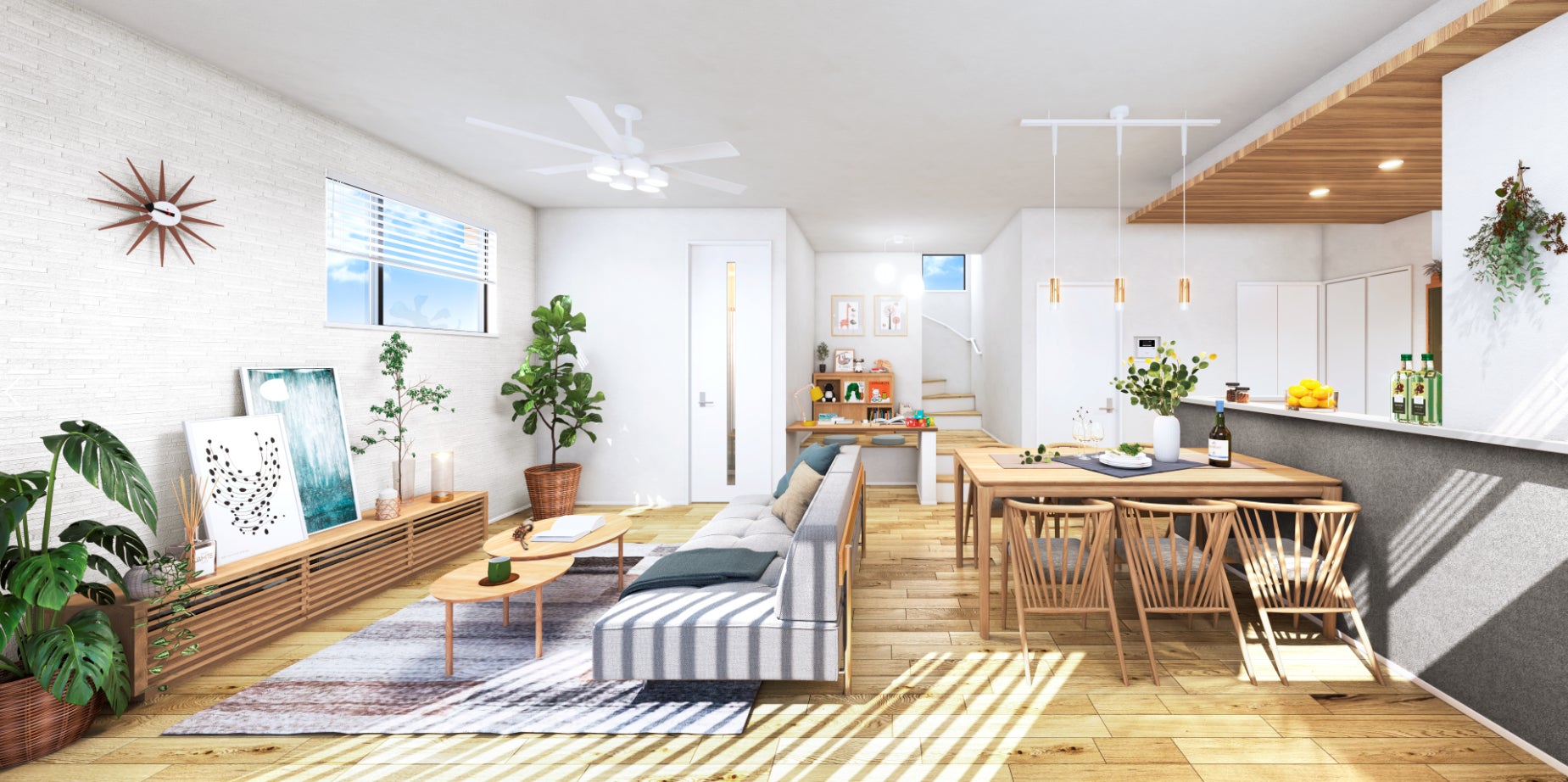 天然木のフロアが木のぬくもりを与え、TV背面・キッチン腰壁・天井にアクセントクロスを採用し個性を演出。子どもがのびのびと暮らすことができる心地よい空間をデザインしました。また、2階には居室を4部屋採用しているので、夫婦・子ども部屋はもちろん、大容量の収納スペースとして使ったり、書斎や趣味の部屋など多彩に利用できます。