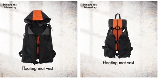 浮力体が簡易マットになるフローティングベスト。前身頃のポケットに必需品を収納。衝撃吸収材入りフードで防災頭巾に。組み合わせで色々な形に変形可能な浮力体マット。