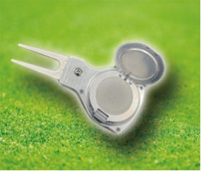 グリーンフォーク、マーカー、ボールワイパーの3つの機能が一体となった今までにないゴルフアイテム。高級感がありプレー中もポケットの中が気にならないコンパクトサイズ。