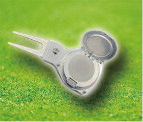グリーンフォーク、マーカー、ボールワイパーの3つの機能が一体となった今までにないゴルフアイテム。高級感がありプレー中もポケットの中が気にならないコンパクトサイズ。