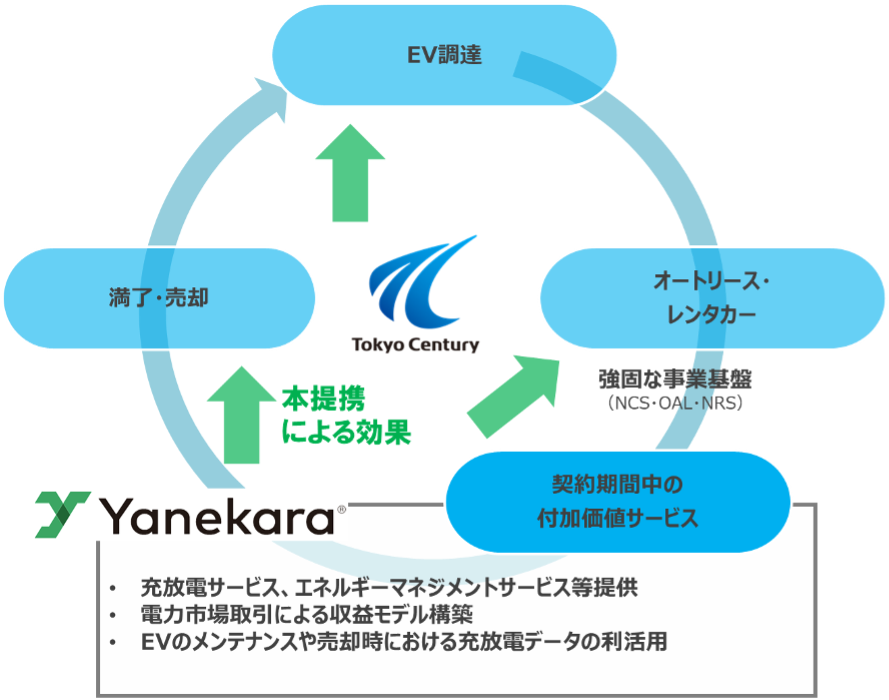東京センチュリーの広範な顧客基盤やEVリースの知見・ノウハウとYanekaraが有する充放電システムに関する革新的な技術を持ちより、リースを通じて、EVならびに充放電マネジメントシステムの導入を拡大できるものと考えております。両社は、今後とも互いの経営資源を組み合わせて新たな価値を創出することが、脱炭素化・カーボンニュートラルの推進に資するとの認識で一致したため、本提携に至りました。