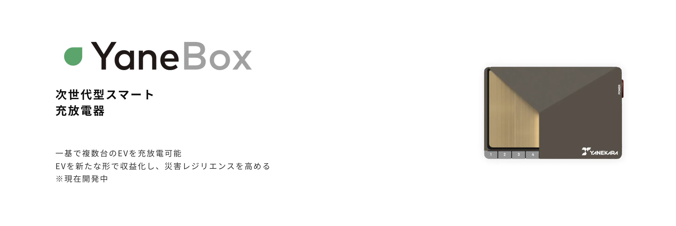 Yanekaraは、私たちが暮らす「屋根から」自然エネルギーによる電力自給を目指し、屋根に設置した太陽光パネルからEVに電気を蓄えるだけではなく、EVに蓄えた電気を建物等にも供給できる充放電機器(YaneBox)を開発しています。これは、複数台のEVを1基の充放電機器で管理できる独自商品であり、企業や自治体などでの活用が期待されています。また、複数のEVに蓄えられた電気を遠隔で制御する充放電マネジメントシステムも提供しており、EVの蓄電能力を電力の需給調整に活用する取組みにも注力しております。