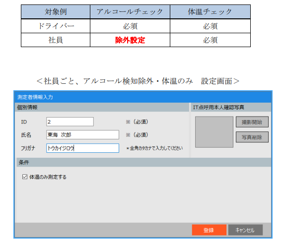 当システムは、アルコール検知記録機能に体温記録機能を加えたものですが、お客様のなかでは、アルコールチェックは不要で、体温チェックだけを記録・管理したい企業様ニーズも想定され、以下の運用も可能となっています。