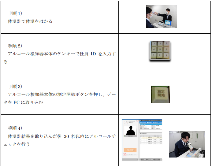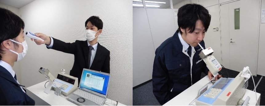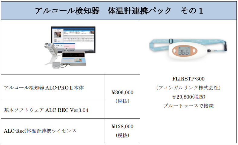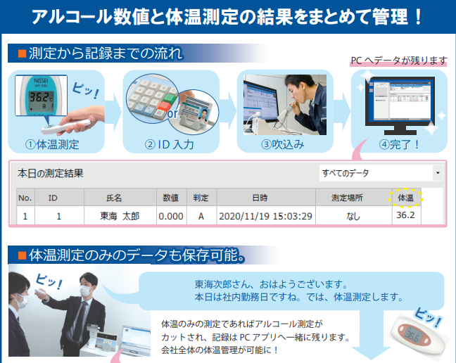 今回システム化したのは、すでに運輸業界で1万事業所で実績のある、点呼アルコール検知システム ALC-PROⅡと、ブルートゥースでPCに接続できる体温計です。すべての従業員のアルコールチェックの結果と、体温計の結果を、PCにある同じアプリケーション内で統合的に管理することが出き、継続的な体制構築にお役立ていただけるシステムです。