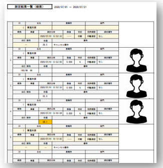 アルコールチェックの結果と同様、氏名、日次、体温が電子保存されており、いつでも紙帳票として出力することができます。