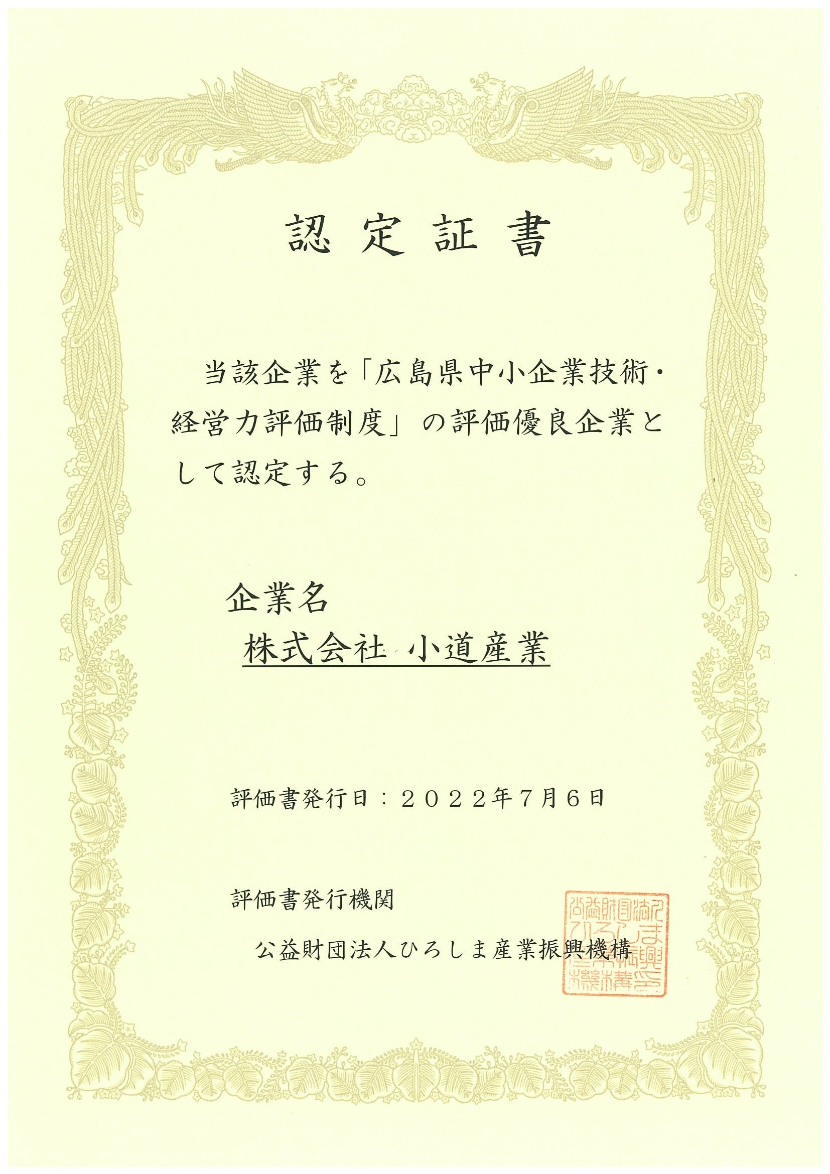 造園・土木工事業を行う株式会社小道産業(本社:広島県、代表者:西山 修二)は、公益財団法人ひろしま産業振興機構が運営する中小企業技術・経営力評価制度において、「評価優良企業」に認定されたことをお知らせします。企業価値向上に向けた本業支援の一貫として、呉信用金庫 海田支店様よりお申込みいただきました。