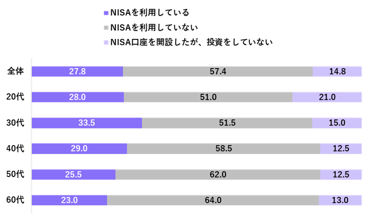 現行NISA利用率は全体の27.8%だった。また「NISA口座を開設したが投資をしていない」が14.8%確認された。年代別で見ると、20代において「NISA口座を開設したが投資をしていない」が21.0%で他の年代よりも高い。