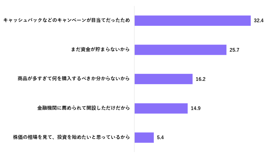 NISA口座を開設したが、投資を行わない理由は「キャッシュバックなどのキャンペーンが目当てだったため」が32.4%でトップだった。