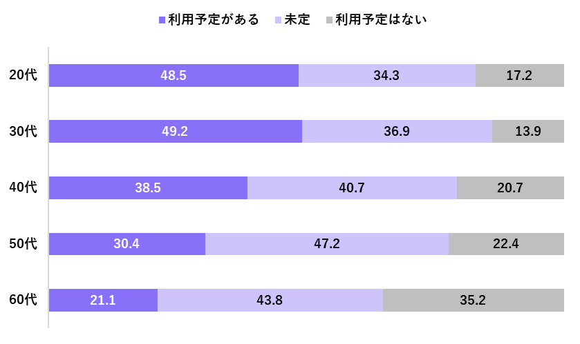 年代別で見ると、20代と30代の約半数が「新NISAの利用予定がある」と回答し、若年層の利用意向が高いことが分かった。