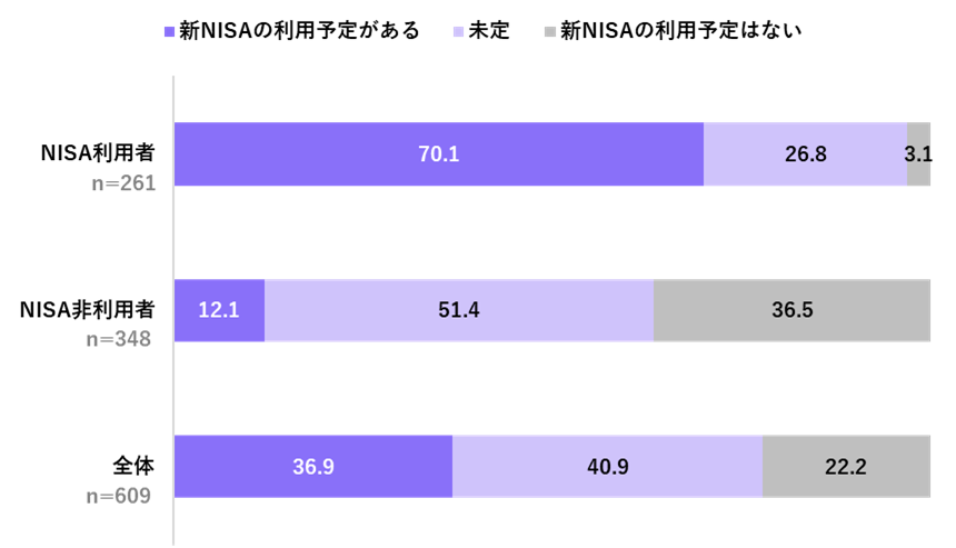 「新NISA認知者」を対象に、新NISAの利用予定を聴取したところ、全体では36.9%が「利用予定がある」と回答した。また、現在のNISA利用状況別で見ると、NISA利用者の70.1%が「利用予定がある」と回答した。一方、NISA非利用者では「利用予定がある」は12.1%に留まり、「未定」が半数を占める。