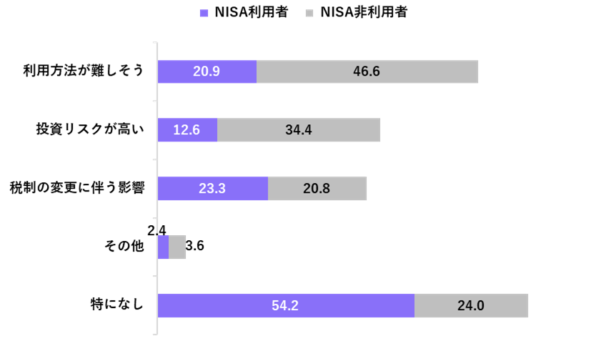 新NISAの「利用予定がある」または「未定」と回答した方を対象に、新NISAの利用に関して懸念している点を複数回答で聴取した。NISA利用者は「特になし」(54.2%)が最も高いのに対し、NISA非利用者では「利用方法が難しそう」が46.6%と最も高かった。