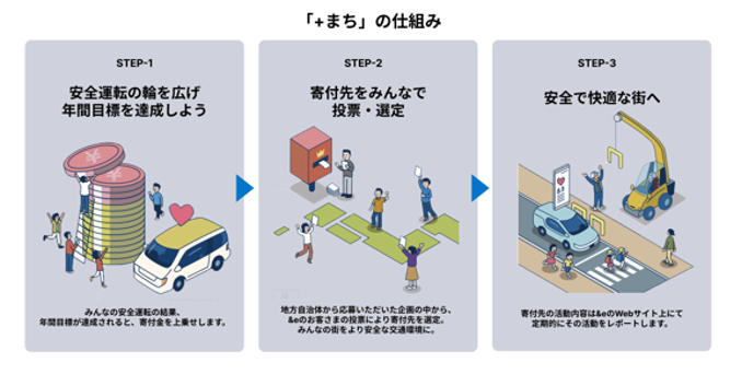 今回のプロジェクトでは「安全な交通環境・社会の実現」をテーマに地方自治体から企画を募集し、保険を契約されているお客さまの投票によって企画を選定します。寄付額等はお客さまの事故率に応じて決定し、選定された企画へ寄付を行い、官民一体となって社会・地域課題の解決を目指します。