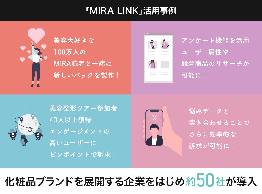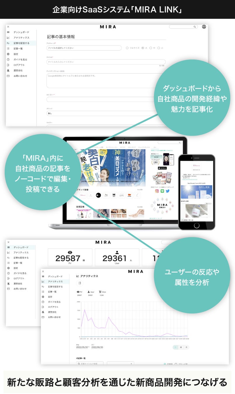 そうした中、化粧品メーカーをはじめとした企業向けに自社商品に関する記事投稿や顧客分析機能等を有するSaaS(Software as a Service:クラウド上のソフトウェアを、インターネット経由でユーザーが利用できるサービス)システム「MIRA LINK(ミラ リンク)」をローンチし、事業の拡大を目指します。