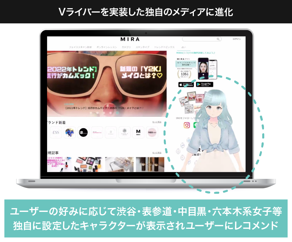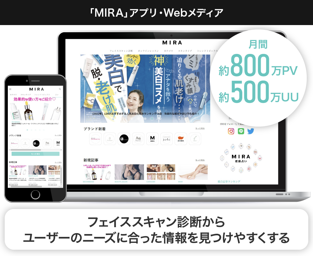 「MIRA」はアプリだけでなくWebメディアとしても展開しており、月間約800万PV(Page View)、500万UU(Unique User)を超えています(※この数値はアプリ、Web合わせたものです)。これまで対面型でしか行えないとされてきた「美容診断」を写真1枚わずか数十秒(通信環境によって変動)で行える独自のアルゴリズムを駆使し、化粧品業界を主とする企業に商品連動型の広告枠も提供しています。