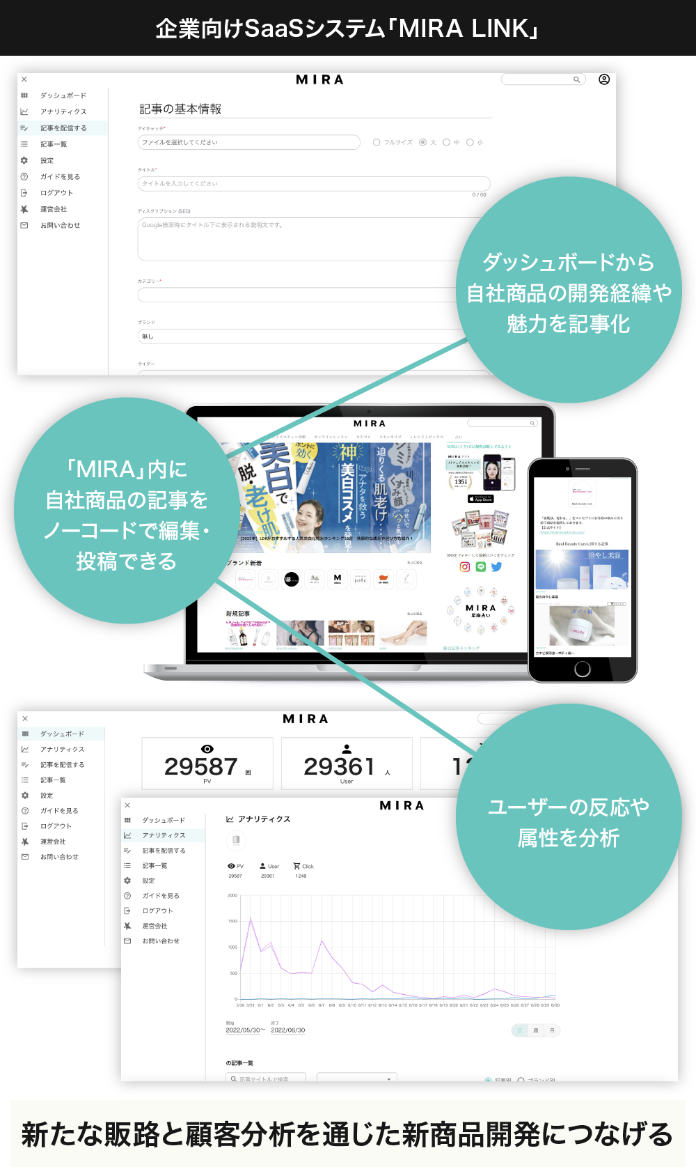 そうした中、化粧品メーカーをはじめとした企業向けに自社商品に関する記事投稿や顧客分析機能等を有するSaaS(Software as a Service:クラウド上のソフトウェアを、インターネット経由でユーザーが利用できるサービス)システム「MIRA LINK(ミラ リンク)」をローンチし、事業の拡大を目指します。