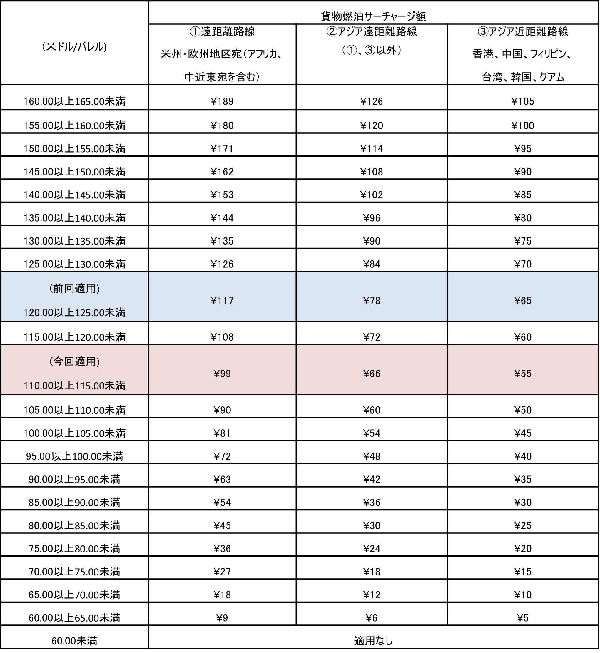 貨物燃油サーチャージテーブル(表示価格は貨物1kgあたり)